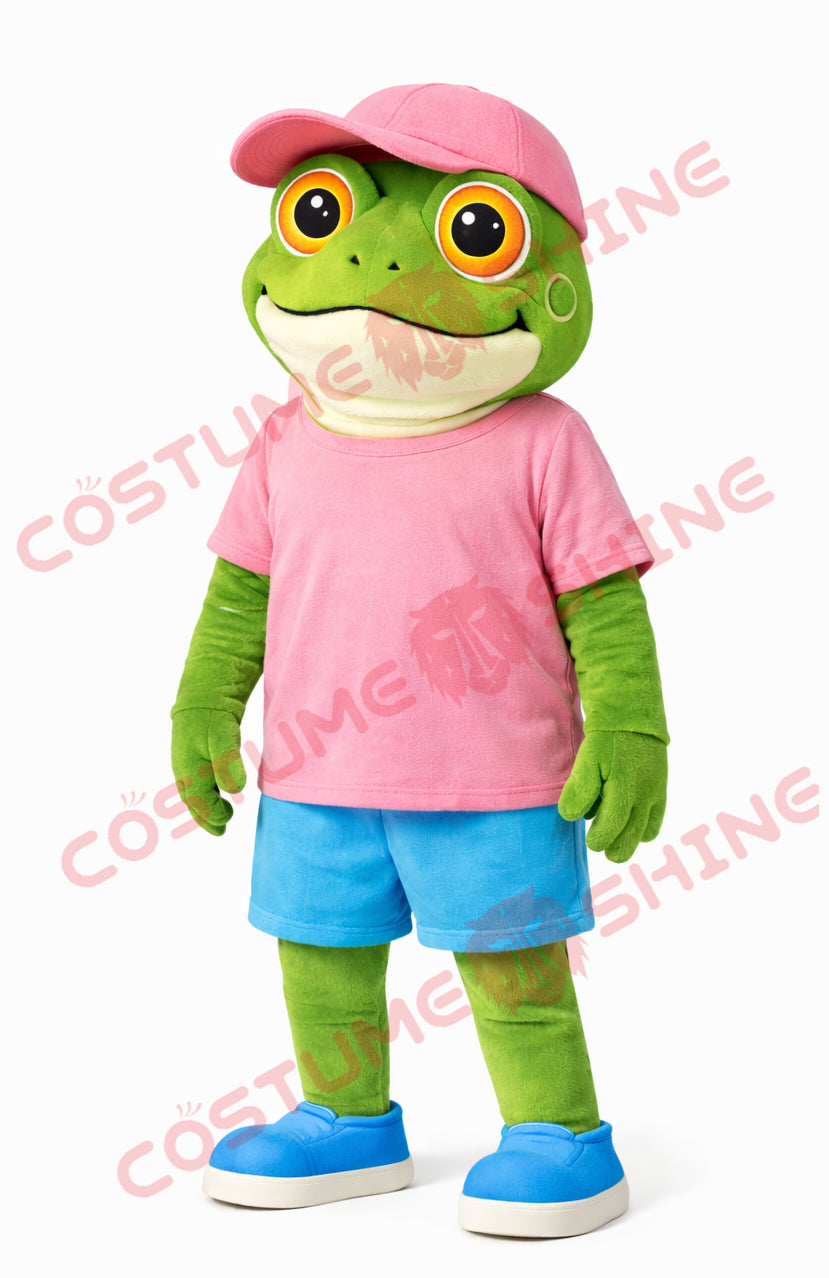 Adult Frog Mascot Costume Pink Shirt Blue Shorts Full Body Suit