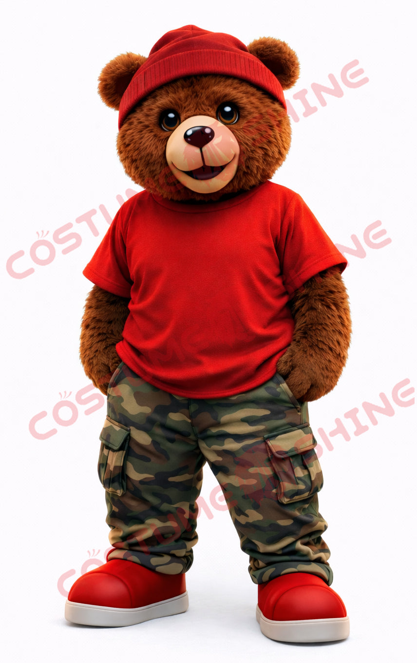 Brown Bear Mascot Costume Adult Red Shirt Camo Pants Casual Suit