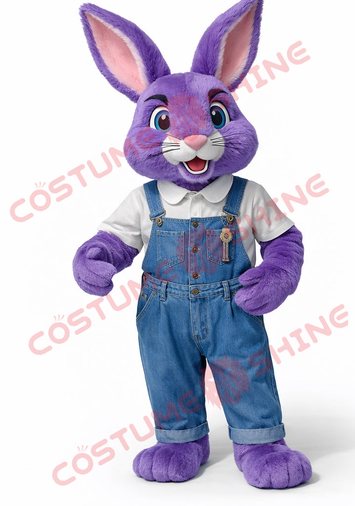 Purple Rabbit Mascot Costume with Denim Overalls – Adult Mascot Suit