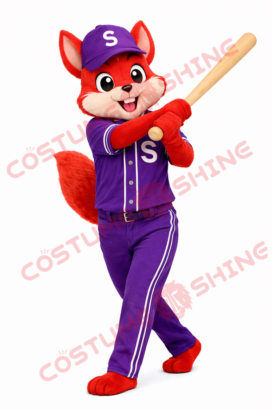 Red Squirrel Mascot Costume Adult Purple Baseball Uniform