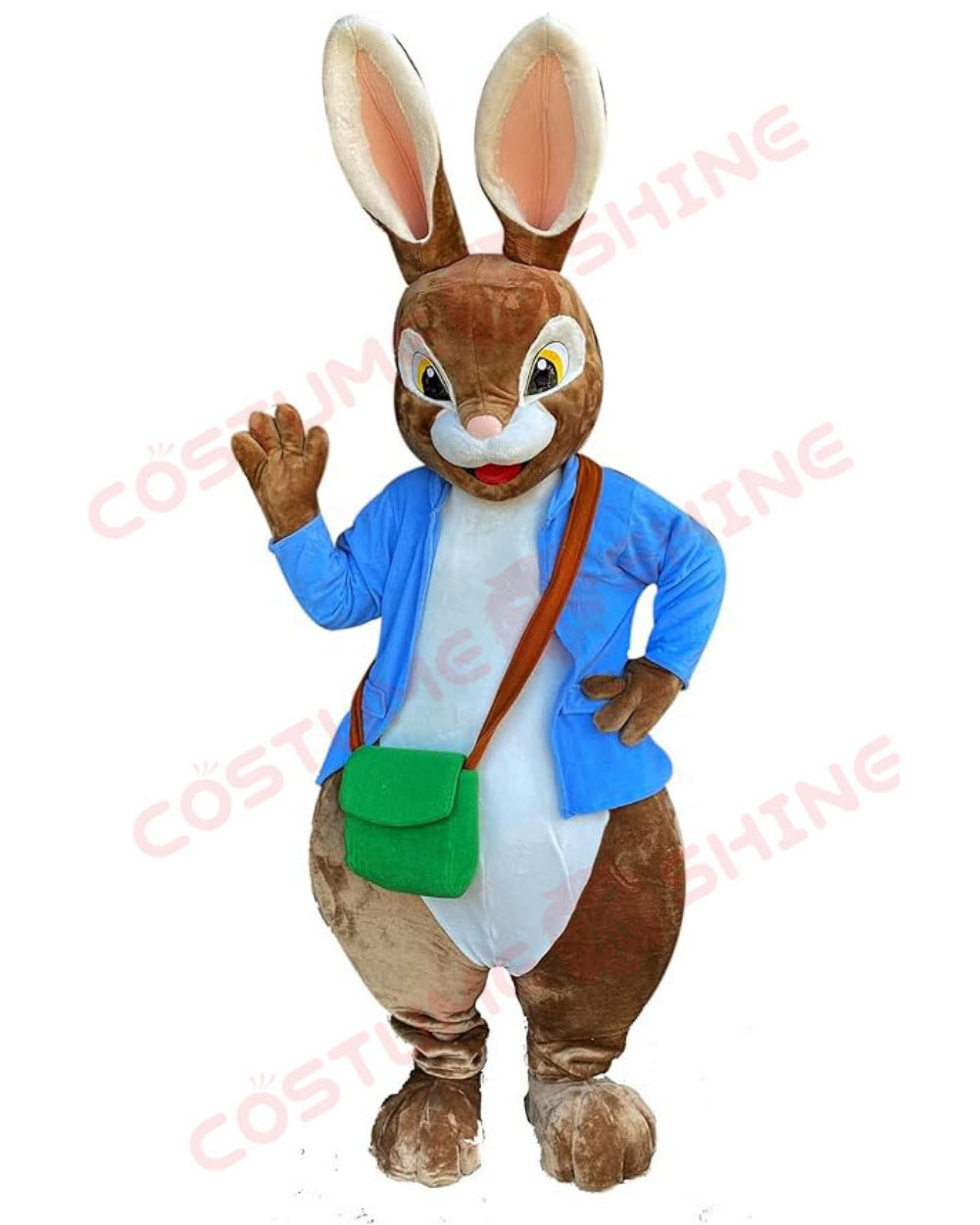 Brown Easter Bunny Rabbit Mascot Costume in Blue Shirt & Green Bag