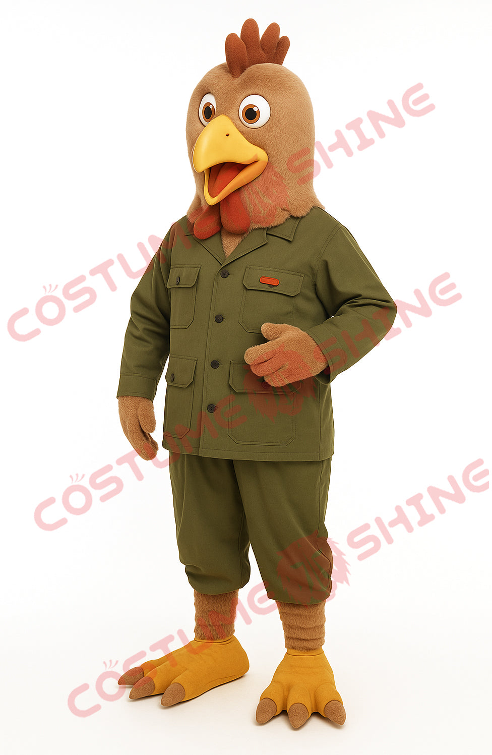 Brown Chicken Mascot Costume in Green Uniform – Custom Plush Rooster Suit