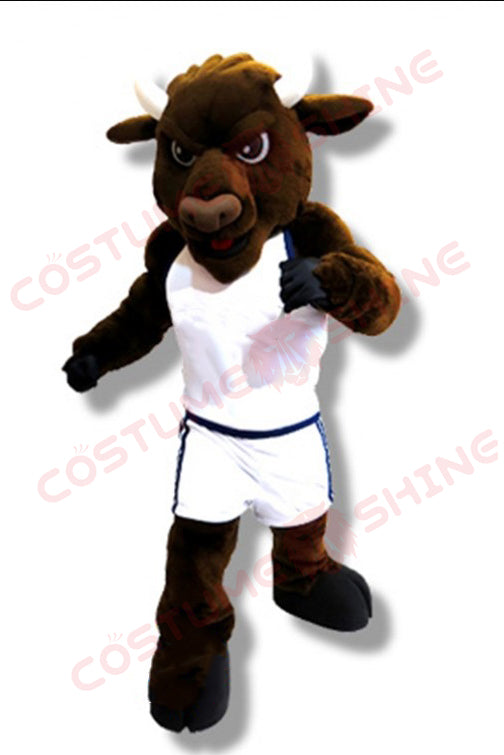 Dark Brown Bison Mascot Costume in White Sports Uniform