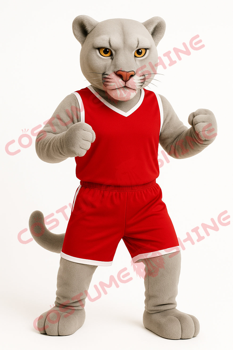 Gray Cougar Mascot Costume in Red Basketball Outfit – Plush Full Suit