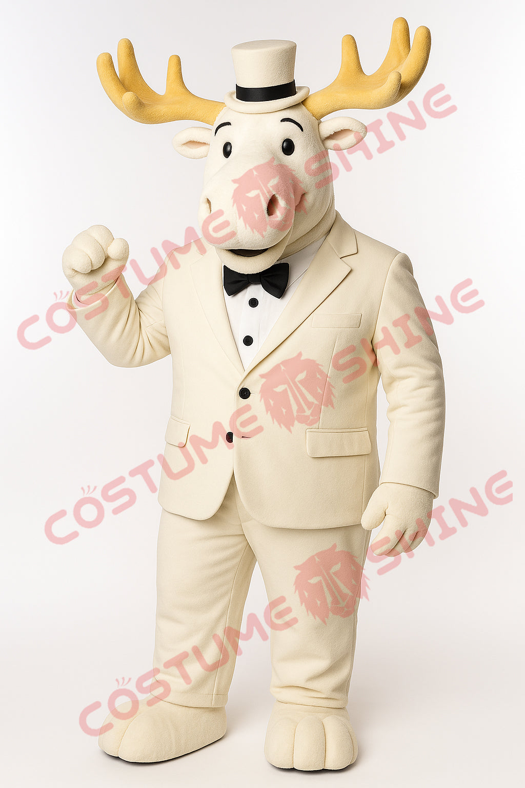 White Tuxedo Moose Mascot Costume with Bow Tie and Top Hat