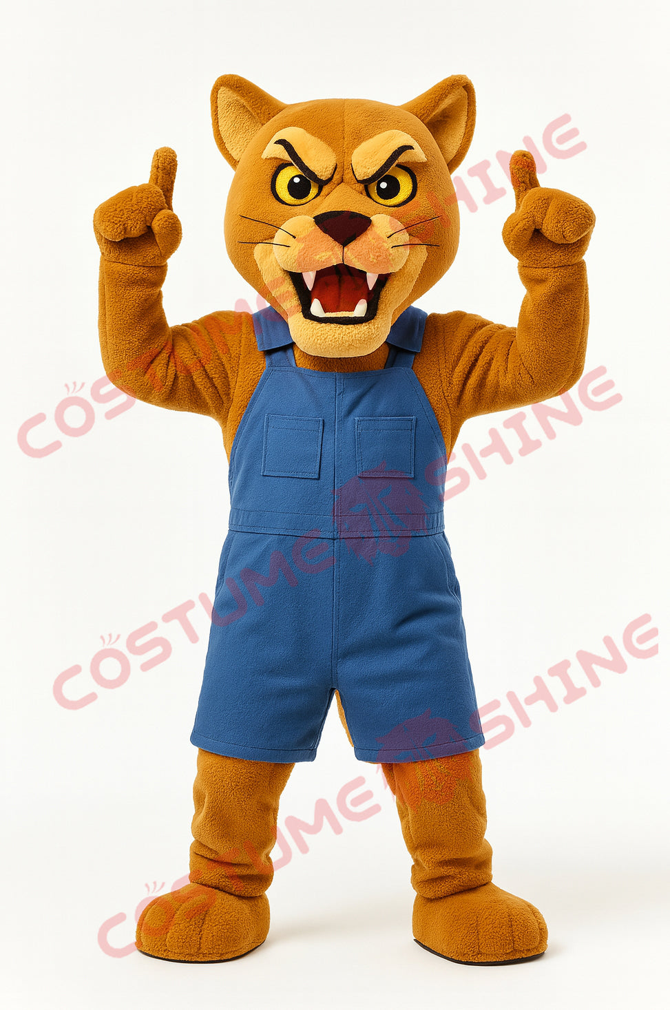 Orange Cougar Mascot Costume in Blue Overalls – Full Plush Suit